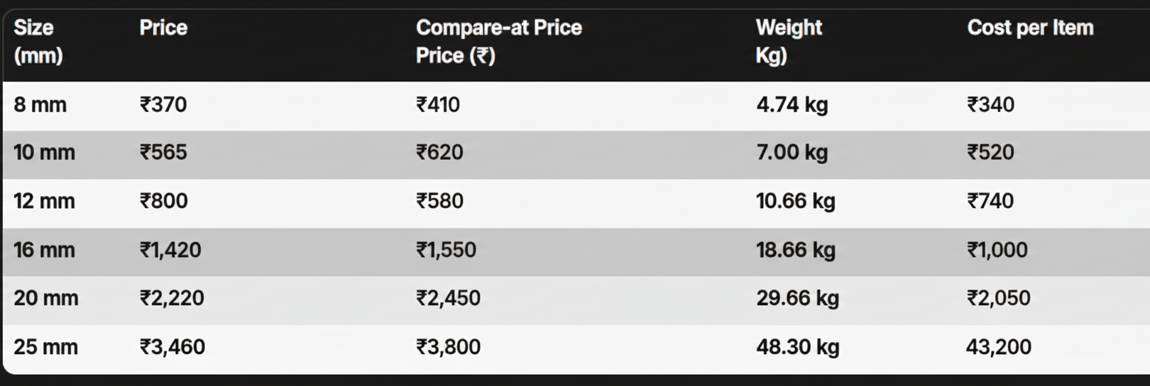 Diameter (Size): Available in 8mm, 10mm, 12mm, 16mm, 20mm, 25mm.